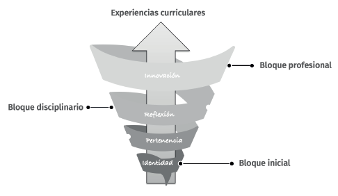 El citado modelo fid releva el valor del prácticum como un espacio en donde el sujeto construye progresivamente su identidad profesional y, por tanto, reflexiona permanentemente sobre su desempeño en el contexto educativo e innova en su quehacer a partir de un compromiso manifiesto con la comunidad escolar en la que se inserta -expresado a través de un sentido de pertenencia-. Lo expuesto, da origen a cuatro principios que articulan las experiencias curriculares y la trayectoria formativa, organizada en tres bloques fundamentales: inicial, disciplinario y profesional. La lógica de este modelo se esquematiza a continuación: