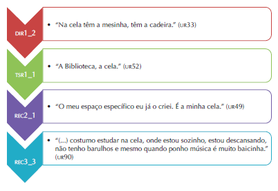 Como pode ser verificado pelas Unidades de Registo exemplificativas, apresentadas na Figura 1, a cela, por ser o local mais recatado, acaba por ser a escolha dos reclusos para o estudo. Também, Gabriel (2007) a este respeito já tinha constatado na década passada que: