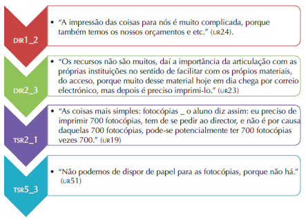 O pagamento das fotocópias e impressões dentro dos EPS está a cargo dos reclusos. Dadas as limitações económicas de muitos deles e não havendo um orçamento próprio dos EPS para estudantes envolvidos em processos de alv ou para o Ensino Superior, como refere o dir1_2, “[...] tem de ser sempre a família a ajudar nessa parte [fotocópias e materiais]” (UR23).