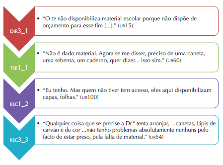 Assim, verifica-se, pois, que o material escolar não é um entrave para os estudantes/reclusos, independentemente da sua situação económica, porque as direções dos eps, tendencialmente, disponibilizam o material essencial, apesar de não estarem obrigados, formalmente, a fazê-lo.