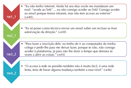 (...) receio, pois como as pessoas não têm grande conhecimento, a solução mais cómoda é dizer que não. Não há razão técnica nenhu- ma, que impeça os reclusos de terem acesso à Internet. Fale disso seja a quem for, vão ter 32000 problemas, “porque ligam, porque não sei quê, e se partirem aquela caqueirada, como vai ser? Porque os USB´s dão para ligar e carregar o telemóvel” que que quer lhe diga? Não é das condições materiais, é da cultura institucional. (TSR2_1: UR32).