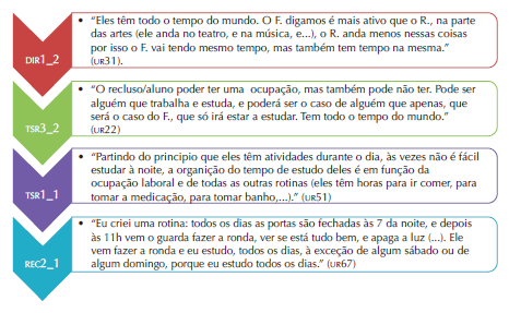 No entanto, a leitura e análise das unidades de registo exemplificativas na Figura 6 permite-nos perceber que a questão da disponibilidade do tempo é uma questão relativa e relaciona-se, sobretudo, com a gestão que cada estudante/recluso faz do tempo que tem disponível nos horários previamente fixados pelos EPS. Na opinião das direções e de alguns técni- cos, os reclusos têm todo o “tempo do mundo” para estudarem. Outros destacam a necessidade de gerir bem o tempo, em função das atividades que desenvolvem ao longo do dia.