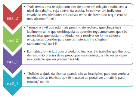 e há um recluso que quer frequentar formação profissional há divul- gações de cursos, candidata-se, se há uma técnica que ao nível da dinamização, da coordenação, da articulação; faz todo o sentido a ren- tabilização e harmonia entre as coisas, até com as diferentes entidades formadoras, ou seja que haja uma pessoa que possa fazer de mediadora, facilitadora, que potencialize também a informação de fora para den- tro, e também de dentro para fora. Tem a ver com esta otimização e satisfação de todos. (TSR5_3: UR8).