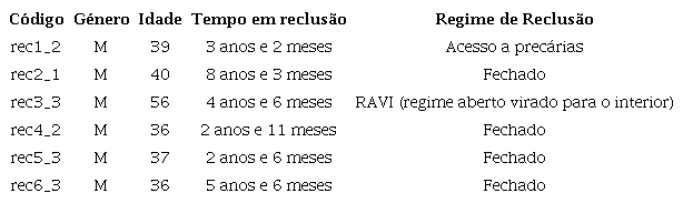 A nossa amostra foi constituída por um grupo de seis reclusos (rec) de três estabelecimentos prisionais em Portugal (Paços de Ferreira, Vale do Sousa e Coimbra), representando estudantes já com a frequência de cursos na modalidade de ead, na Universidade Aberta (uab), Portugal, por cinco técnicos superiores de reeducação (tsr), estando todos a exercer funções nos presídios em questão, e elementos das direções dos respetivos presídios (dir). Procurámos, assim, captar de forma ampla e multidimensional a realidade estudada, através da visão dos diferentes atores envolvidos no processo. A opção por analisar estes contextos prisionais, justifica-se pelo facto de já existirem nestes estabelecimentos prisionais comunidades de aprendizagem de estudantes-reclusos matriculados em cursos da UAB.