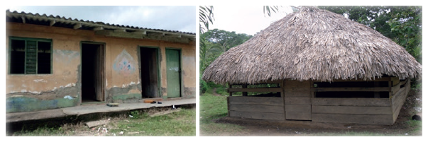 En esta comunidad hemos producido conocimientos, de manera colaborativa, con, por y para los gunadules de Alto Caimán,4 como puede verse en Tamayo (2012) y Cuéllar (2017). En esa producción colaborativa de conocimientos, hemos visitado en varias ocasiones su territorio, con la autorización y acogida de la comunidad en pleno. Particularmente, hemos trabajado en torno a la educación en el Centro Educativo Rural Alto Caimán (en sus dos sedes (figura 1). Allí, la comunidad y los investigadores hemos problematizado el currículo escolar indígena, en la búsqueda de una escuela indígena en la que sea posible mantener los conocimientos indígenas, que circulan en las prácticas sociales, asociados a los conocimientos [matemáticos] 5 y a la identidad cultural de la comunidad gunadule.
