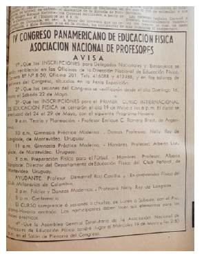 En mayo de 1965 se realizó el Cuarto Congreso Panamericano de Educación Física en la ciudad de Bogotá, Colombia. El evento internacional formó parte de un conjunto de inquietudes y preocupaciones cuyos orígenes se remontaban a los inicios de la década de los cuarenta. En esos años, 1941 y 1942, se organizaron en Buenos Aires una serie de encuentros entre referentes destacados de la especialidad y autoridades estatales vinculadas al amplio universo de la cultura física, la educación física y la educación en general de varios países americanos. Argentina, Bolivia, Brasil, Chile, Perú y Uruguay tuvieron representantes en dichos espacios. Entre las autoridades y los especialistas que motorizaron el primer congreso panamericano sobresalieron por su influencia y experticia el uruguayo Raúl Blanco, el argentino César Vázquez y el brasileño Joao Barbosa Leite (Scharagrodsky, 2021; Dogliotti, 2015).