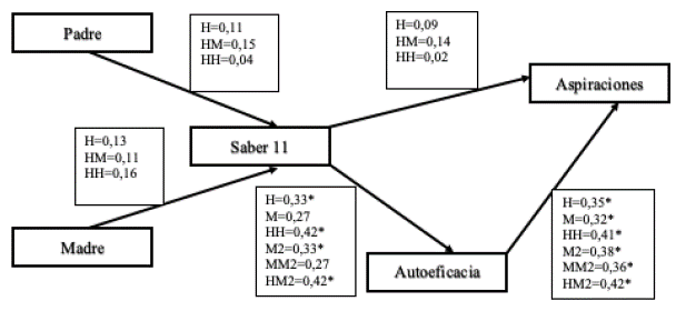 En el modelo final con el tamaño de muestra total (n=182) se encontró que dos de las cinco hipótesis fueron comprobadas: las pruebas Saber 11 están directa y positivamente relacionadas con la autoeficacia universitaria y a su vez, la autoeficacia universitaria está directa y positivamente relacionada con las aspiraciones universitarias. El modelo final no encontró relaciones significativas entre el nivel educativo del padre y la madre con las pruebas Saber 11, ni una relación directa entre las pruebas Saber 11 y las aspiraciones universitarias, sino mediada por la autoeficacia. Al eliminar las rutas no significativas en el modelo, la relación entre la autoeficacia y las aspiraciones universitarias tuvo un ligero incremento (de 35,7 % a 38,9 %).