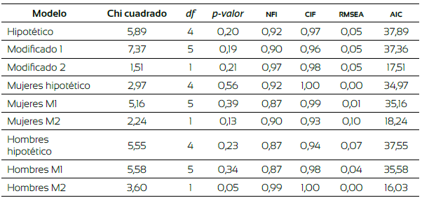 La evaluación de la bondad de ajuste de un modelo requiere tener en cuenta varias medidas simultáneas porque no existe una sola prueba estadística para identificar un modelo correcto (Schermelleh-Engel et al., 2003). La prueba de chi cuadrado es utilizado para evaluar la idoneidad de un path analysis; se espera un chi cuadrado no significativo, lo cual indica que los datos observados se ajustan a los datos hipotéticos (Tabachnick y Fidell, 2001). Debido a la sensibilidad del chi cuadrado al tamaño de muestra, otras pruebas no dependientes del tamaño de muestra -aunque sensibles a especificaciones incorrectas del modelo- serán identificadas: índice de ajuste normalizado (NFI), índice de ajuste comparativo (CFI), error cuadrático medio de aproximación (RMSEA) y el criterio de información Akaike (AIC) (Schermelleh-Engel et al., 2003). NFI valores por encima de 0,90, CFI valores por encima de 0,94, RMSEA valores por debajo de 0,06 son indicadores de un buen ajuste de los datos (Tabachnick y Fidell, 2001). AIC valores cercanos a 0 indican un mejor ajuste cuando se comparan modelos con diferente número de constructos (Escobedo Portillo et al., 2016).