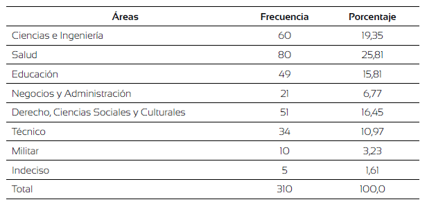Los encuestados escribieron la carrera o las carreras que les gustaría estudiar. Para el análisis, las respuestas se organizaron en siete grupos teniendo en cuenta la clasificación única de ocupaciones para Colombia correspondiente al gran grupo 2 de profesionales, científicos e intelectuales y del gran grupo 3 de técnicos y profesiones de nivel medio (DANE y SENA, 2018). La tabla 2 presenta las preferencias por áreas ocupacionales de los estudiantes en donde las áreas de la salud y las ciencias e ingenierías son las de mayor preferencia.