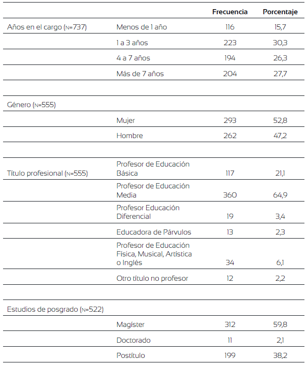 La población objetivo de este estudio (directores y jefes de UTP en centros escolares con educación secundaria) fue identificada a partir de una base de datos proporcionada por el Ministerio de Educación que contenía el correo electrónico de 1867 directivos en estos cargos. Luego de tres invitaciones, respondieron un total de 993 personas (52,9 %), de las cuales 737 correspondían a directivos en centros escolares que impartían educación secundaria completa y regular. Entre estos, 554 eran directores, 111 jefes de UTP y 66 ocupaban otros cargos responsables del trabajo de la unidad departamental. En la tabla 1 se presentan datos de las características demográficas de la muestra considerada en el análisis de datos.