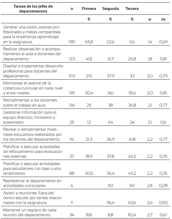 La tarea en la cual se observa mayor consenso es respecto a generar una visión, valores profesionales y metas compartidas para la enseñanza y aprendizaje en la asignatura; un 65 % la identifica como la tarea más importante. Otra tarea que concita consenso en cuanto a su prioridad es realizar observación o acompañamiento al aula a docentes del departamento. La revisión y retroalimentación de materiales educativos elaborados por los docentes del departamento es señalada como la más importante por el 41,5 %, pero para un 28,6 % esta tercera en importancia. Se observa aún más dispersión en la importancia relativa que se asigna a que el jefe de departamento revise o retroalimente recursos educativos elaborados por sus pares con solo uno de cada cinco, señalando esta como la tarea más importante y cerca de la mitad la pone como tercera en importancia.