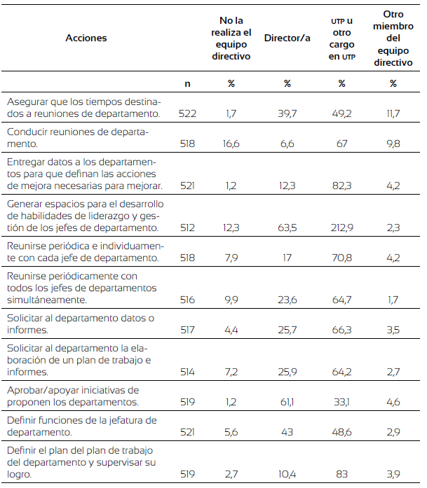 Respecto a las diversas acciones del equipo directivo para gestionar el trabajo de los departamentos son dos las realizadas por casi todos los participantes (ver tabla 3). Por una parte, se gestionan los recursos y apoyo que solicitan los departamentos y, por otro, se procura que los tiempos destinados para las reuniones departamentales se cumplan. Lo más habitual es que el director gestione los recursos y favorezca espacios para el desarrollo del liderazgo en jefaturas departamentales. El jefe de UTP es quien frecuentemente trabaja directamente con los jefes de departamentos para definir el plan de trabajo, su supervisión, desarrollo y cumplimiento de metas, proveer datos para acciones de mejora y reunirse periódicamente con departamentos y jefes. Esta tendencia se refuerza al observar que se reporta con un 84 % que es alguien del equipo directivo quien conduce las reuniones de departamento, indicándose que quizás el trabajo de los jefes de departamento es más de gestión que de liderazgo, distribución de tareas en el interior de los equipos directivos que coincidiría con el foco pedagógico esperado de esta estructura organizacional.