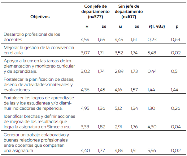 Al comparar mediante la prueba Anova las respuestas entre centros escolares con jefaturas con aquellos sin este cargo, se observan diferencias estadísticamente significativas respecto al trabajo colaborativo y un foco en mejorar la convivencia (ver tabla 4). Donde no existe jefatura, es más importante mejorar la colaboración y la gestión de la convivencia. Donde existen jefaturas, se da mayor importancia a cerrar brechas de aprendizaje.