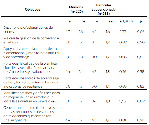 En la valoración de los distintos objetivos, se observan algunas diferencias estadísticamente significativas (p >,05) según la dependencia del centro escolar, pero no según el tipo de programa curricular que imparte. Como se observa en la tabla 5, en el sector municipal se enfatiza más el desarrollo profesional, y en el sector particular subvencionado se enfatiza más la importancia de cerrar brechas de aprendizaje.