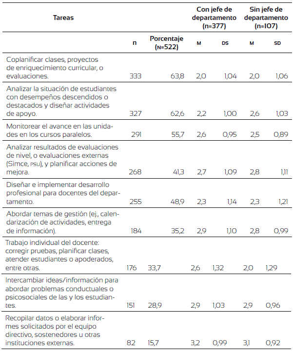 Al consultar sobre las tareas más importantes de los jefes de departamento, se observa bastante dispersión en las respuestas respecto a qué y cuán prioritarias son estas (ver tabla 2). De un total de 344 directivos que reportan las tres tareas más importantes para este cargo, se observa que hay mayor acuerdo en lo que no son tareas prioritarias y menos en las que sí lo serían. En general, la mayoría de los participantes señala que aspectos más administrativos como elaborar informes no son una prioridad, al igual que representar al departamento en actividades cocurriculares. Estos resultados son similares al comparar centros escolares de distintas dependencias, así como con distintos programas curriculares.