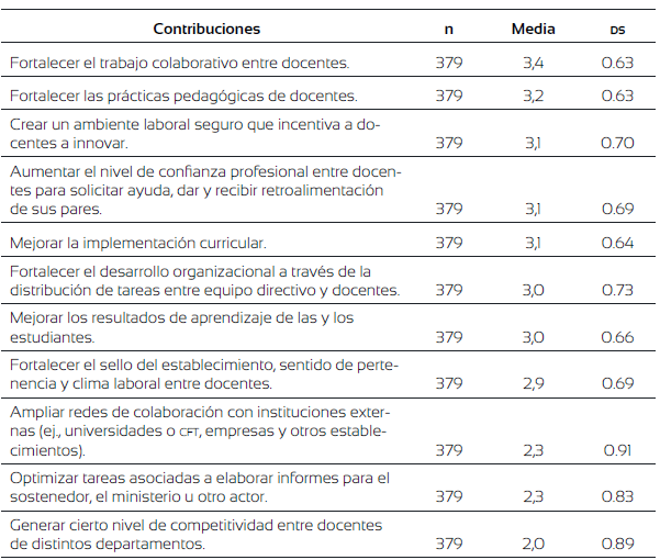 Del listado de las diez contribuciones a los procesos de mejora escolar asociadas a la implementación de unidades departamentales, se observan diferencias estadísticamente significativas entre centros escolares que tienen distintos programas curriculares. Es en los centros que imparten el programa CH donde se reporta una contribución mayor (M=3,3) a la creación de ambientes laborales que promueven la innovación en comparación a los polivalentes (M=3,0) y los TP (M=2,0) (F(2,376)=5.86, p=003). Además, se reporta una mayor contribución a promover el trabajo colaborativo cuando existe la jefatura (M=3,5) en comparación a aquellos centros en los que este cargo no existe (M=3,0) (F(1,377)=5.90, p=016).