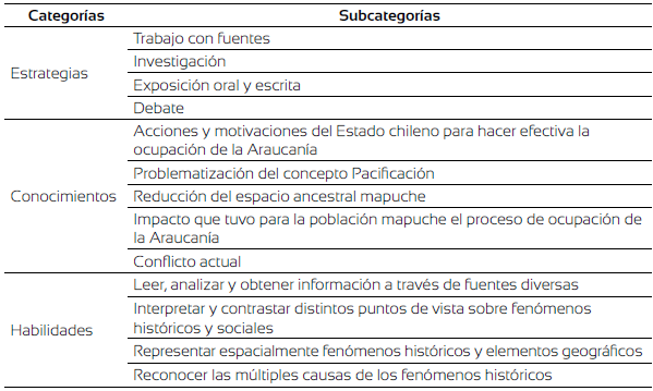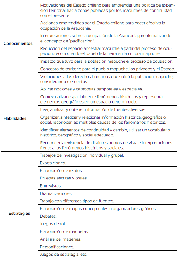 En la tabla 1, se presentan los conocimientos, habilidades y estrategias para considerar en la evaluación del objetivo de aprendizaje asociado con la ocupación de la Araucanía en la asignatura de HGCS. Estos son determinados por el currículo escolar chileno para el primer nivel de secundaria.
