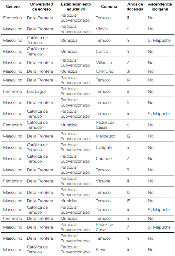 A través de un muestreo aleatorio simple se escogieron veintitrés profesores, dieciocho hombres (78 %) y cinco mujeres (22 %). Todos ellos imparten clases en el primer nivel de secundaria, en seis establecimientos municipales (26 %) y diecisiete particulares subvencionados (74 %). Estos se financian ante todo con el subsidio que les entrega el Estado, más aportes de los municipios en el primer caso y aportes de las familias en el segundo. Se ha logrado contar con profesores noveles y expertos que trabajan en grandes núcleos urbanos y en pequeñas o medianas localidades. Veintidós son egresados de las dos universidades que imparten la pedagogía de esta asignatura en la región (96 %) y cuatro se declaran mapuche (17 %).