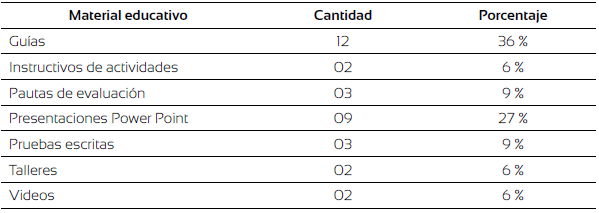 La mayoría del material analizado estuvo constituida por guías (36 %) y presentaciones Power point (27 %).