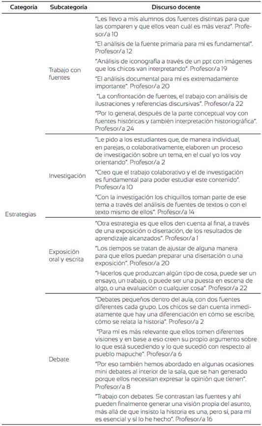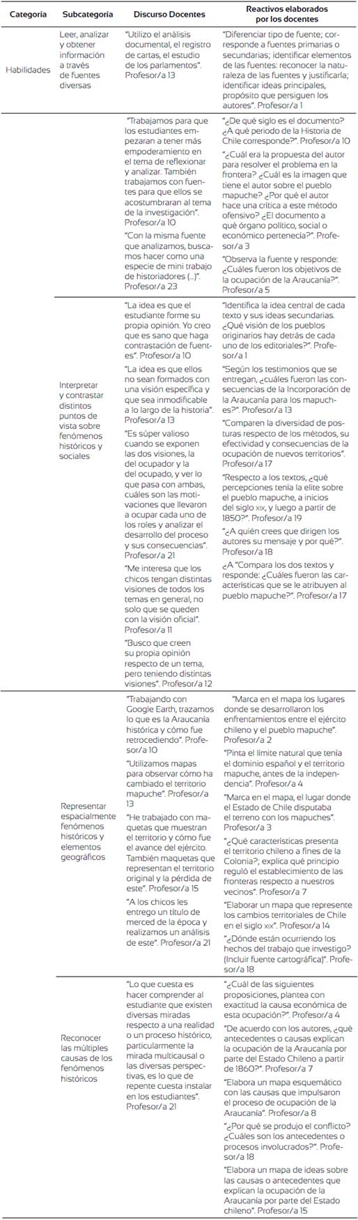 En la primera subcategoría los docentes buscan que los estudiantes identifiquen las características de las fuentes con las cuales trabajan. Se espera que estos puedan replicar el trabajo del historiador para así reflexionar y formar su propia opinión sobre el tema. En la segunda subcategoría, los profesores buscan que los estudiantes reconozcan la existencia de diversas interpretaciones de los fenómenos históricos y sociales. De este modo, forman su propio punto de vista. Para lo anterior, el trabajo con fuentes y el diálogo son las estrategias más utilizadas. En la tercera subcategoría, los docentes aspiran a evaluar la habilidad referida a contextualizar espacialmente fenómenos históricos y representar elementos geográficos en un espacio determinado. Se rescata el uso de recursos cartográficos y herramientas geográficas para representar la reducción del espacio ancestral mapuche. A partir de la observación, el análisis y la representación, los estudiantes comprenden los cambios territoriales en la Araucanía. La última subcategoría se relaciona con que el estudiante sea capaz de reconocer la multicausalidad de los fenómenos históricos. Si bien en las entrevistas no fue un factor que haya resaltado, sí es posible encontrarlo en la revisión del material. A través de diversos recursos, los estudiantes reconocen las causas y antecedentes del proceso, aunque no se les invita a realizar un juicio personal sobre este tema.