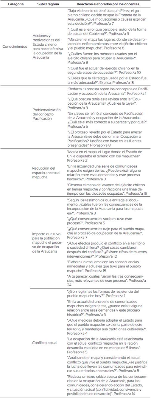 Con relación a la primera subcategoría, los docentes resaltan las acciones emprendidas por el Estado chileno para llevar adelante la ocupación de la Araucanía, no así las motivaciones que este habría tenido. Es interesante ver la relevancia que le otorgan al rol del Ejército en este proceso y que el estudiante evalúe sus acciones. En la segunda subcategoría se busca que el estudiante construya su propia visión del proceso, bajo el dilema de Pacificación u Ocupación. Para lograr esto, utilizan la contextualización a través de lo trabajado en la clase y las fuentes históricas presentadas. En relación con la tercera subcategoría, resaltan el uso de cartografía como recurso para representar la reducción del espacio ancestral mapuche, así como también vincular el proceso con sus actuales reivindicaciones y el conflicto histórico que vive este pueblo con el Estado chileno. La cuarta subcategoría hace referencia al impacto social y territorial que tuvo para el pueblo mapuche la ocupación, sin dejar fuera las repercusiones actuales. Los reactivos se enfocan en que el estudiante conozca estas consecuencias, pero no lo invitan a desarrollar un juicio valorativo de este aspecto. La última subcategoría hace referencia a la situación del pueblo mapuche en la actualidad, principalmente a sus demandas históricas. Los docentes buscan que el estudiante entregue una visión crítica de la forma como se han llevado estas demandas, su legitimidad y el rol del Estado en el conflicto. Además, lo motivan a proponer acciones de solución y convivencia enfocadas en que este pueblo mantenga sus tradiciones.