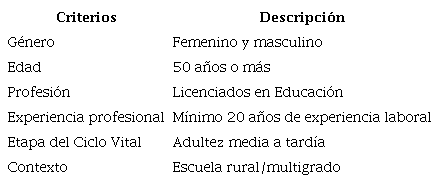 La participación de las y los profesores fue de manera intencional o deliberada (Otzen y Manterola, 2017) puesto que se seleccionaron en función del grado en que cumplían con los criterios y atributos establecidos para la investigación (Véase tabla 1). Participaron 12 educadores/as (7 hombres y 5 mujeres residentes en las regiones Metropolitana, La Araucanía y Los Ríos), cuya edad promedio es de 60 años y acumulan un promedio de 33 años de experiencia profesional en escuelas rurales.