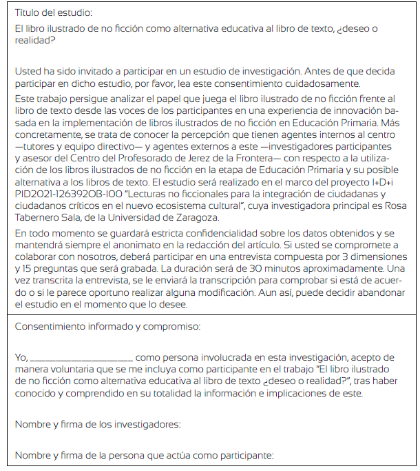 El acceso de los investigadores al campo se produjo gracias a un proceso formativo sobre el uso del LINF como material didáctico. En este proceso, universidad y escuela trabajaron de forma cooperativa en el diseño de propuestas didácticas para dinamizar este tipo de libros en EP, ejerciendo, docentes e investigadores, una relación de co-enseñanza durante su dinamización como formación in situ.