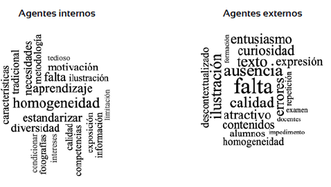 Aunque el LT es el material didáctico más utilizado por los agentes internos, son muchas las limitaciones que estos perciben en su uso, como manifiestan los agentes externos. Una visión global de las limitaciones se muestra en las nubes de palabras reflejadas en la figura 5.
