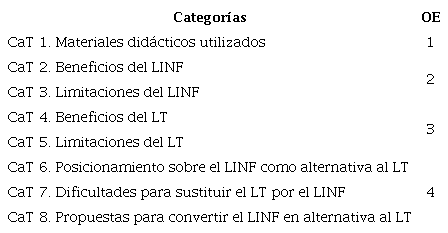 Este objetivo perseguía conocer la opinión de los participantes sobre el uso de LINF como alternativa al LT (P5). En esta búsqueda fue posible identificar la sexta, séptima y octava categoría de análisis.