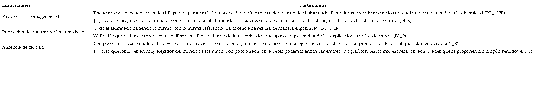 Los agentes internos reiteran la homogeneidad que promueve el uso de LT en las escuelas y las limitaciones que presentan para atender a la diversidad. En cambio, los agentes externos sitúan el foco en la falta de calidad de los textos y las ilustraciones, además de las repercusiones negativas que esto genera para promover la motivación del alumnado. No obstante, ambos agentes coinciden en señalar varias limitaciones (Véase tabla 5).