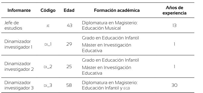 La investigación se ha llevado a cabo durante el curso 2021-2022 en un Centro público de Educación Infantil y Primaria situado en la provincia de Cádiz. Su elección ha estado determinada por criterios de aceptación de la participación y facilidad de acceso. Asimismo, constituye un contexto con alto potencial para promover la actividad investigadora, pues además de utilizar una metodología basada en LT, se encuentra implicado en la elaboración de un PLC, favoreciendo la inclusión y dinamización del LINF a través de un proceso de formación permanente del profesorado. Dispuestos a configurar el tercer espacio educativo del que hablan Zeichner (2010) y Romero-Oliva (2022), en esta investigación han participado tanto agentes internos al centro educativo (seis dinamizadores tutores de EP, el director y el jefe de estudios) como agentes externos (tres dinamizadores investigadores) (Véase tabla 1).