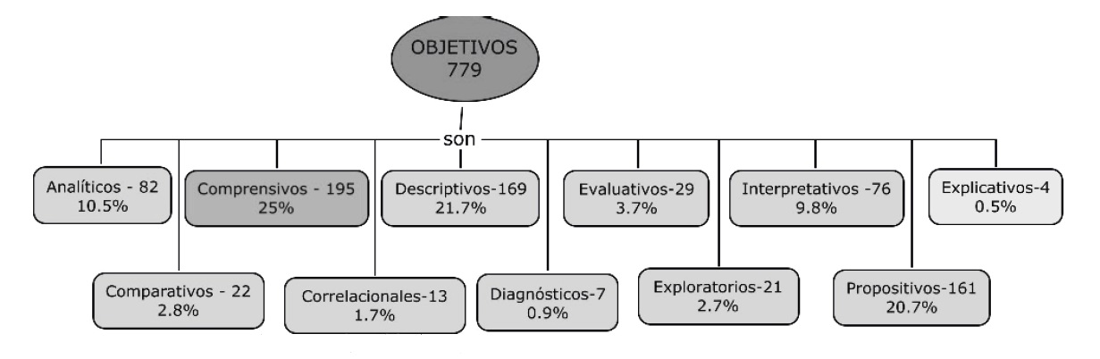 En este artículo se presentan los hallazgos del proceso de investigación respecto del foco de comprensión "Objetivos". En este se agruparon las regiones según propósitos de los diferentes estudios en educación y pedagogía desarrollados en las maestrías y doctorados en Colombia, tomando como muestra 779 tesis que fueron analizadas en su totalidad, en el marco de las categorías foco definidas (en este caso objetivos). En algunas investigaciones se referían a objetivos, en otras a pretensiones, en algunas a propósitos y en otras no estaban explícitos siendo necesario deducirlos de los informes generales. Las agrupaciones se realizaron tomando en cuenta la teleología de los trabajos, en términos de la pretensión final del estudio. En el sentido anterior, se pueden entrever las siguientes regiones investigativas: