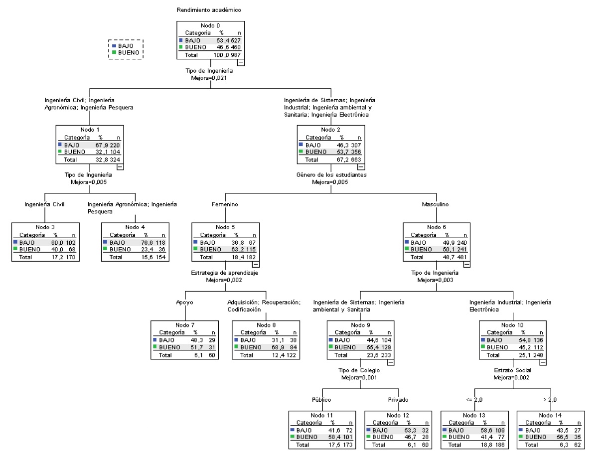 En el nodo 1 se encuentran los estudiantes de los programas Ingeniería Agronómica, Pesquera y Civil que representa el 32,8% (324 estudiantes) del total de los estudiantes y se aprecia que el 67,9% (220 estudiantes) de éstos tienen un rendimiento académico bajo y el 32,1% (104 estudiantes) un rendimiento bueno, que refuerza lo expuesto en el análisis de regresión logística, en donde se presenta que éstos tres programas cuentan con los valores de (B) y Exp(B) más bajos dentro de esta variable (en orden descendente: Civil, Pesquera y Agronómica). El nodo 1 se divide en los nodos 3 y 4, pertenecientes a los estudiantes del programa de Ingeniería Civil (nodo 3) e Ingenierías Agronómica y Pesquera (nodo 4). Para el caso de los estudiantes del programa de Ingeniería Civil (nodo 3), se observa que el 40% ellos tienen un rendimiento académico bueno, mientras que los programas de ingeniería Agronómica y Pesquera (nodo 4), tienen tan sólo un 23,4% de estudiantes con rendimiento académico bueno.