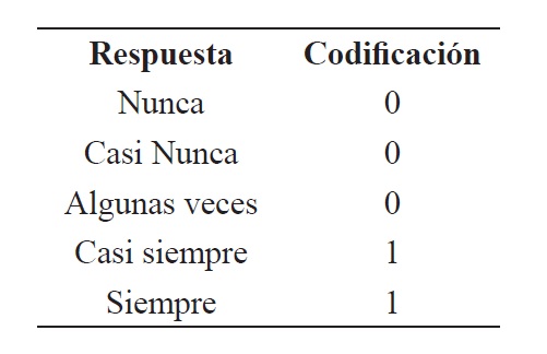 En la encuesta se trabajan 5 opciones de respuesta, las cuales son "nunca", "casi nunca", "algunas veces", "casi siempre" y "siempre". Cada una de ellas representa la frecuencia en la utilización de la técnica de estudio a la cual se hace referencia. Para el análisis de los resultados se le asigna a cada grupo de respuesta un valor, quedando codificado de la siguiente manera (tabla 2):