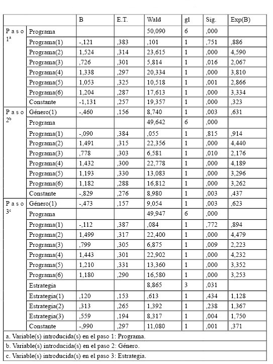 Los resultados obtenidos por la regresión logística muestran que los niveles género=femenino, programa=ingeniería pesquera y estrategia=apoyo, son los valores de referencia para el modelo, por tanto, tienen un coeficiente (B=0) y un Exp(B)=1, y todo el análisis se realizó comparando los otros resultados obtenidos de acuerdo con estos niveles.