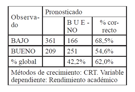 El modelo presentado puede predecir en un 61,3% de los casos si un estudiante de ingeniería de la Universidad puede tener un rendimiento académico bueno o bajo.
