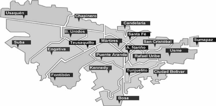 Secretaria Distrital de Gobierno. (s.f.). Mapa de Bogotá con las localidades. Recuperado de http://www.gobiernobogota.gov.co/quienes-somos/alcaldias-locales/bogota-y-sus-localidades.