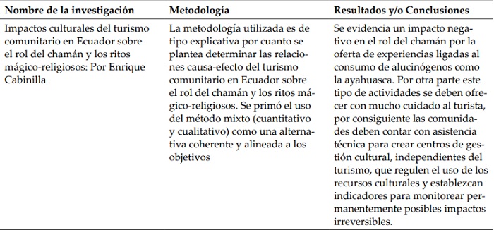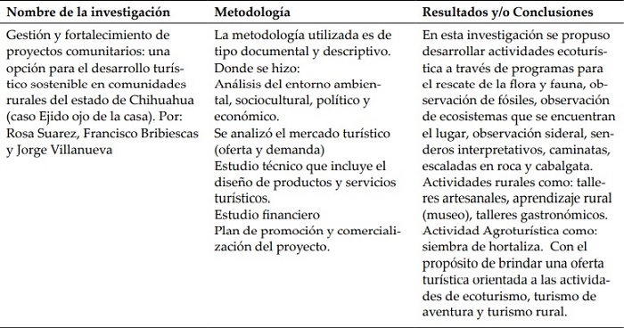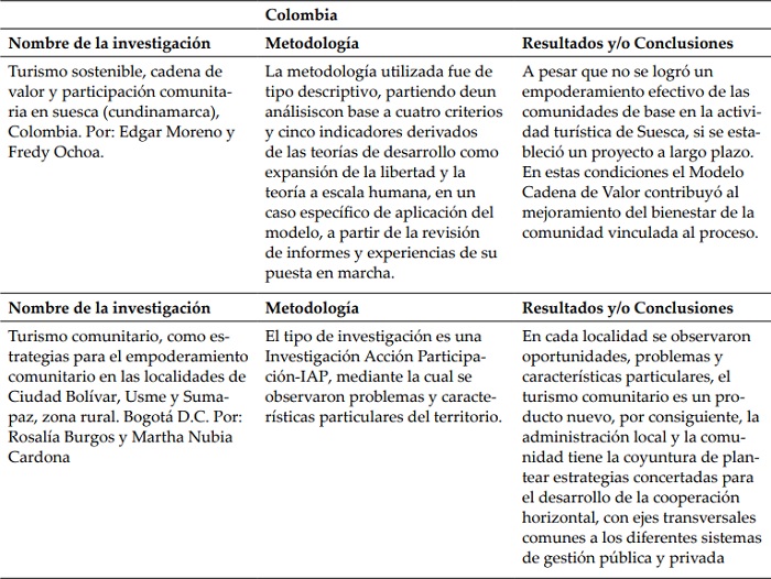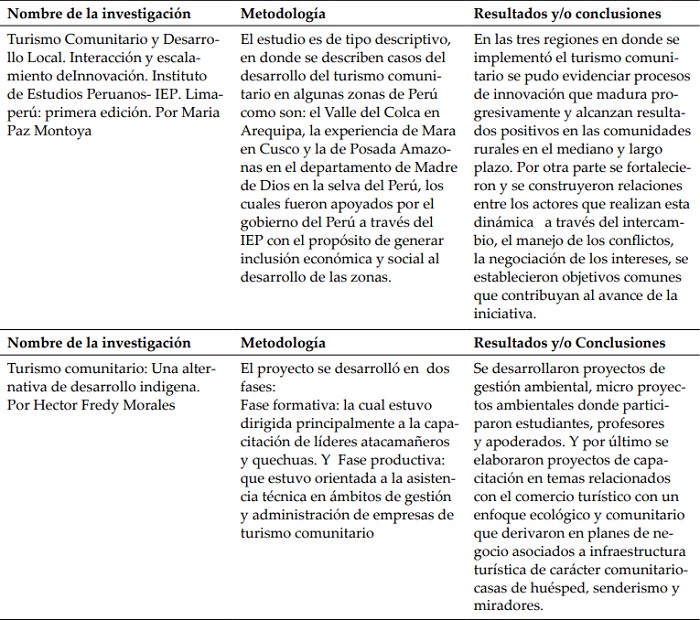 En América Latina se vienen impulsando proyectos de turismo comunitario con el fin de promover el desarrollo de las comunidades locales, entre las que se pueden resaltar está el desarrollado por los siguientes investigadores: en Ecuador, Cabanilla (2015) y Santana y Atiencia (2013) en Bolivia; Maydana y Lima (2012), Cox (2009); en Venezuela, Guzmán, Borges y Castillo (2011),en Argentina, Morales (2006), y Román y Ciccolella (2009) en México; Barrera y Alvarado (2009); Suárez, Bribiescas y Villanieva (2013) en Chile; Skewes, Henríquez y Pilquimán (2012), Casas, Domingo y Pastor (2012); en Nicaragua, Cañada y Fandiño (2009), Torres Obando (2015), Guzmán y Cañizares (2009) en Perú, Montoya (2013) y Pastor, Jurado y Domingo (2011); en Costa Rica, Nel-Lo (2008), y Salas (2011); en Brasil y Rodrigues, Corbari, Cioce y Jurema (2014) y Helmsing y Fonseca(2011), Pastor, Gómez y Espeso (2012), Neide y Cioce (2013); en Panamá, Villete (2012); Fundación Codespa (2013), Yanza (2012), Montoya (2013). En este sentido, se exponen a continuación algunas de las investigaciones desarrolladas (ver tabla 1).