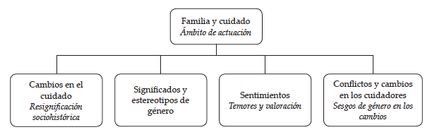 El análisis de la categoría familia estuvo guiado por la indagación de aspectos como los cambios en las formas de cuidar, los significados de cuidado, los estereotipos que se refuerzan en el cuidado de hombres y mujeres, las percepciones sobre el cuidado que ejercen las familias, los conflictos o desacuerdos que en el hogar se presentan por el cuidado de niños, niñas y adolescentes, los sentimientos y las preocupaciones contemporáneos de los cuidadores, la identificación de personas que intervienen en el cuidado y los cambios en las vidas de los cuidadores por desempeñar este rol (figura 1).