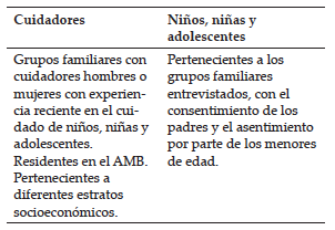El tipo de muestreo fue no probabilístico por conveniencia acorde con los criterios de selección establecidos para cuidadores y menores de edad participantes. En la tabla 2, se sintetizan los criterios.