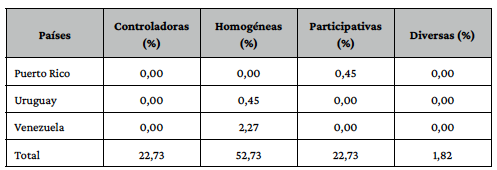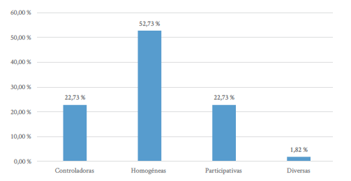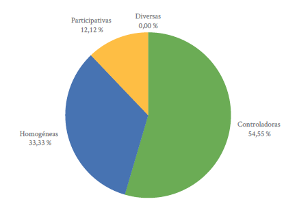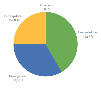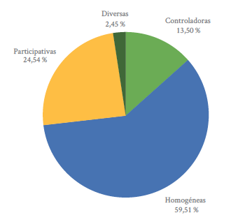 La figura 3 detalla cómo más de la mitad de las instituciones seleccionadas (116 del total) entran en la categoría de homogéneas; en segundo término, se encuentran, en la misma condición, las categorías controladoras y participativas, con 50 instituciones en cada caso. Finalmente están las del tipo diversas, que solo se ve en cuatro casos.
