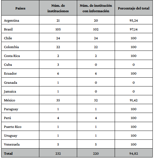 Mediante una búsqueda en sus páginas web y en las de los ministerios de Educación (y/o Educación Superior, según corresponda), se examinaron las normativas, con el propósito de saber cuáles gi aparecían explícitamente en sus legislaciones. Fueron descartadas aquellas en las que no se encontró información o no tenían el estatus universitario. De esa forma, se eliminaron doce universidades: las casas de estudio de Cuba, Granada y Jamaica, una institución en Argentina, tres en Brasil y tres en México. La muestra quedó finalmente constituida por 220 universidades (tabla 1). A partir de ello, se desarrolló la categorización, que incluye los disímiles escenarios encontrados, independiente del origen de su propiedad, es decir, tanto en las instituciones públicas estatales como en las privadas o privadas confesionales.