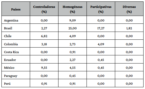 Brasil, con 102 universidades, es la única nación con presencia en todas las categorías, fenómeno que se puede asociar a que es el país con mayor cantidad de instituciones. Argentina es lo opuesto a Brasil, en razón de que incluye 20 instituciones que se ciñen solo a la categoría homogéneas. Los resultados de Chile y Colombia son llamativos, dado que ambos países aportan al estudio instituciones públicas, privadas y confesionales, cuentan además con una cantidad similar de estas (24 y 22 respectivamente). No obstante, se observan diferencias en cuanto a las tipologías. En las universidades chilenas el mayor porcentaje recae en las coníroladoras, mientras que en Colombia, en las paríicipaíivas; por tanto, es posible asumir que en las universidades colombianas hay mayor participación de los gi.