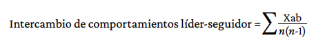 Intercambio de comportamientos líder-seguidor. El intercambio de comportamientos entre líder y seguidor se calculó usando la conceptualización propuesta por DeRue (2011). Este autor se basa en que, en dicho intercambio, ambos individuos pueden tomar tanto el comportamiento de líder como el de seguidor. Para determinar si un individuo surge como líder o como seguidor, se aplicó la siguiente pregunta, basada en Yukl et ál. (2002): ¿Esta persona generó influencia en mí, en el cumplimiento de mis tareas mediante acciones como: establecimiento de objetivos, asignación de roles o supervisión del desarrollo de las tareas? Si, por ejemplo, el estudiante A responde afirmativamente respecto al estudiante B, A se caracteriza entonces como seguidor y B como líder. Así, este valor del intercambio para cada individuo se utiliza en la ecuación 1, la cual refleja en el numerador cuántas veces el estudiante tomó tanto el comportamiento de líder como de seguidor en cada una de las relaciones con sus pares y el denominador tiene como función dar una medida del tamaño del equipo, siendo n la cantidad de individuos que lo componen.
