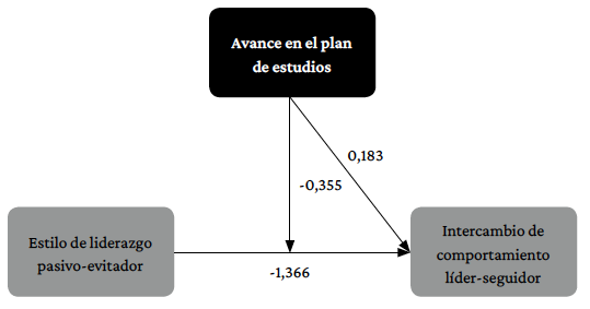 Por último, al estudiar el efecto moderador del semestre de estudio en la relación entre el estilo de liderazgo pasivo-evitador y el intercambio líder-seguidor, se puede ver que este resultó ser negativo (β = -0,355; P< 0,01). Esto quiere decir que estudiantes que poseen niveles altos de estilo de liderazgo pasivo-evitador en sus primeros semestres de estudio son más propensos a intercambiar los comportamientos líder-seguidor que en semestres más avanzados, lo cual da soporte a H3.
