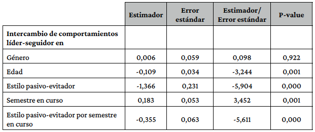 Así, dentro del proceso de liderazgo se espera que estos estudiantes sean menos capaces de cambiar de comportamiento. A partir de esto, la hipótesis 1 (H1) se plantea de la siguiente manera: los estudiantes con mayores niveles de estilo de liderazgo pasivo-evitador se relacionan de manera negativa con el intercambio líder-seguidor.