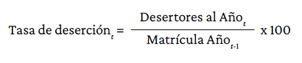 Se consideró para el objeto del estudio el año de la última matrícula como base para el cálculo del año de la deserción. Teniendo en cuenta que este dato puede contar para el primer o el segundo semestre, se consideró que la deserción se produjo en ese mismo año (t) para los matriculados en el primer semestre; en cambio, en el caso de los estudiantes cuya última matrícula fue en el segundo semestre, se considera que la deserción se produjo al año siguiente (t+1).