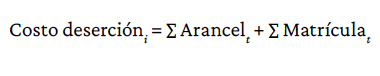 (1)La estimación del costo monetario se basó en lo que desembolsaron los desertores en el periodo señalado, para lo cual se consideraron los valores históricos de arancel según el caso del estudiante, así como también el valor de la matrícula. El procedimiento consistió en determinar de cuánto fue la inversión monetaria que se costeó por cada año de estudio. Por lo tanto, el resultado esperado es la estimación del costo que generó un estudiante durante los años de estudio, que se asumen al año de deserción de cada estudiante (ecuación 2).