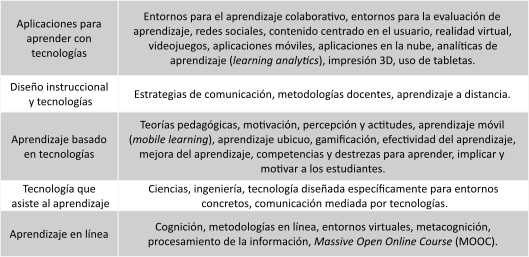 Hsu, Hung y Ching (2013) realizaron una revisión de 2997 artículos internacionales relacionados con la tecnología educativa. Estos autores concluyen, entre otras cosas, que la investigación en tecnología educativa es, a veces, producto de la manera como utilizamos las tecnologías en las escuelas, ya que primero incorporamos la herramienta y luego tenemos que valorar su uso. Entre sus resultados se destaca un análisis en torno a las temáticas de interés, en las que encontramos tres grandes categorías: