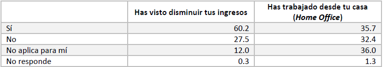 En el tema económico, sobrevivencia, empleo o negocio, la mayoría de la población del país afirma ha visto disminuidos sus ingresos y un tercio trabaja en casa, como se muestra en la tabla 1 de la encuesta.